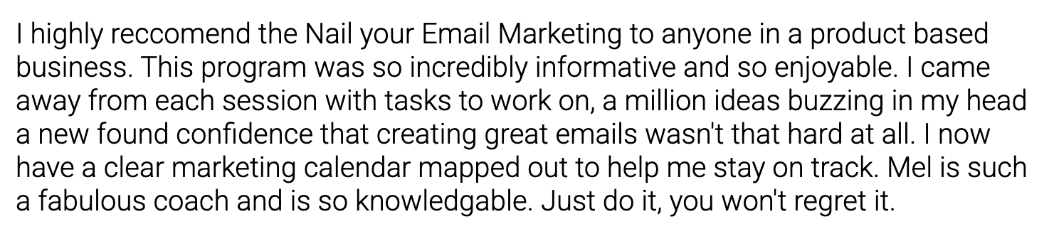 π©βπ» From Overwhelmed to Empowered, like a Boss: We get it, running a busy ecommerce store can be a rollercoaster ride. That's why our program seamlessly fits into your schedule, dishing out foolproof strategies and badass advice to help you dominate your email marketing game. Reclaim your precious time and energy, and invest them where they truly count.