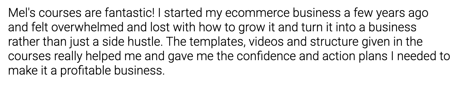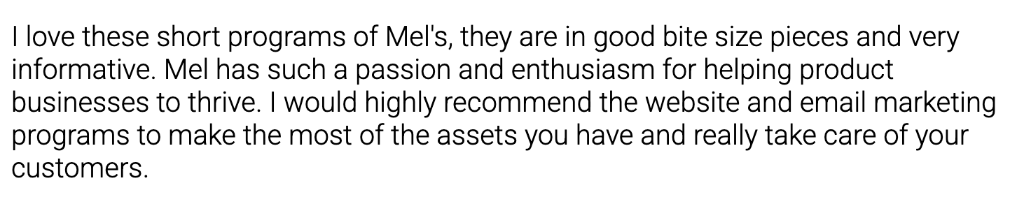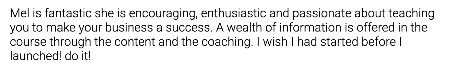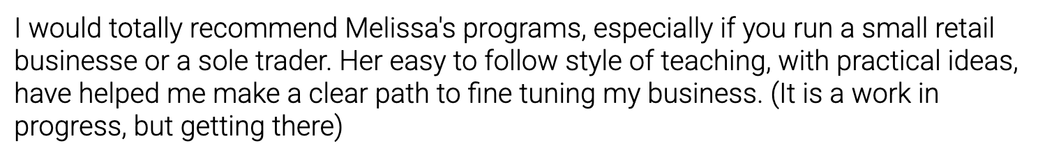 Melissa is an absolute gem and full of so much info! She's a straight talker and really knows her stuff. My kind of gal! She's incredibly supportive and super nice too. If you're a small biz owner and looking to grow your brand definitely have a chat to Mel.